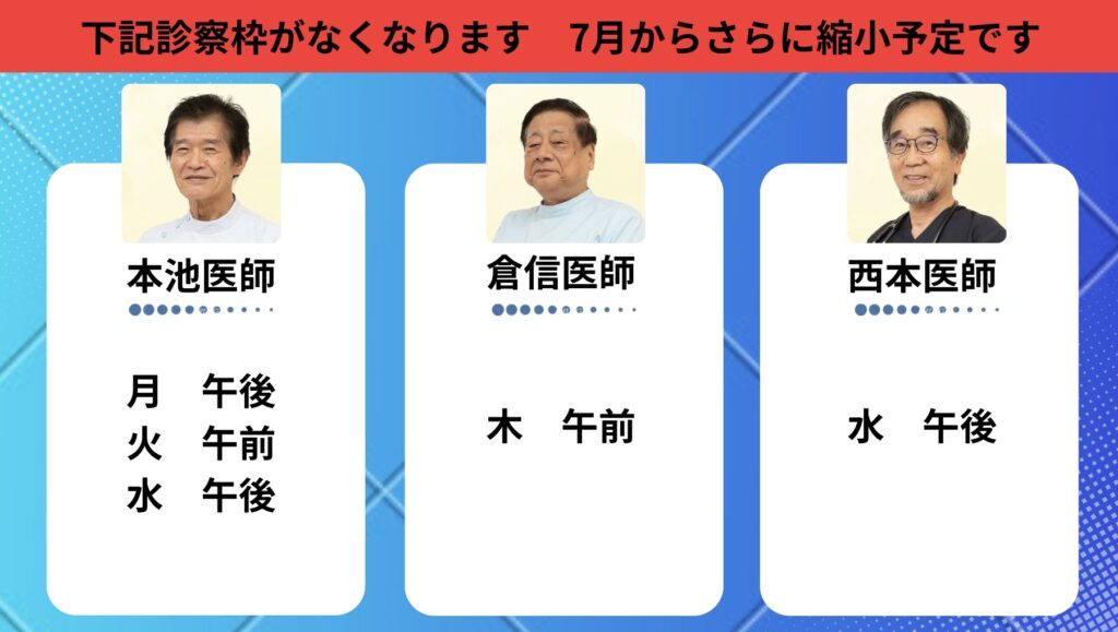 長年診療に携わってまいりました医師の診療日・診療枠も変更となりますので